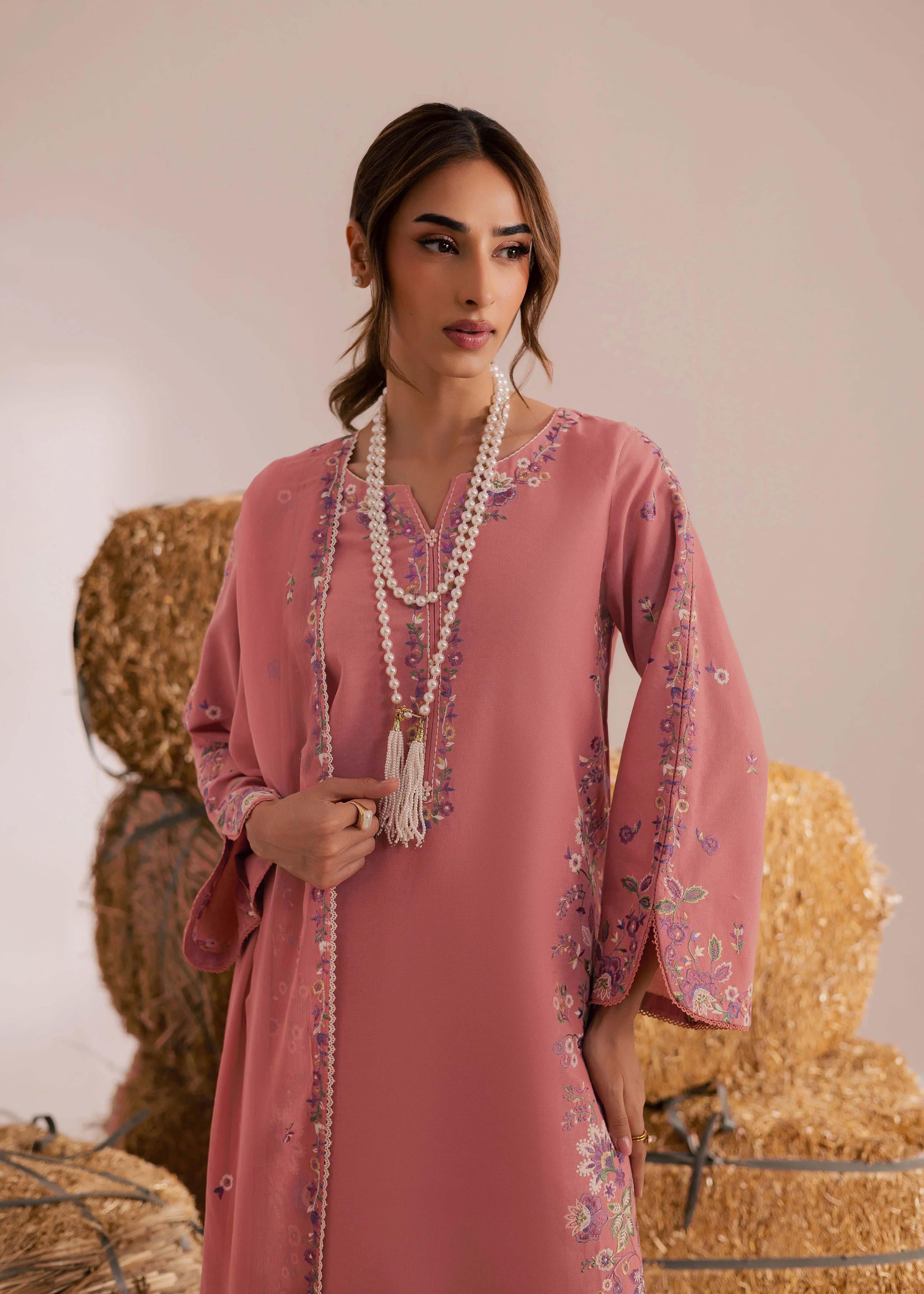 A timeless dusty rose cotton lawn outfit featuring subtle floral embroidery and fine detailing along the neckline and sleeves. Soft, breathable fabric paired with a matching dupatta and trousers creates a graceful and refined festive look. Perfect for effortless elegance this season.